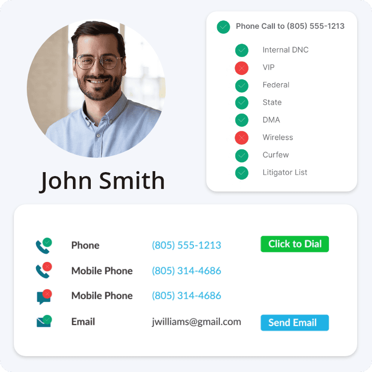 - Enforces voice, pre-recorded messages, SMS, email, human and AI Agents, and mail regulations